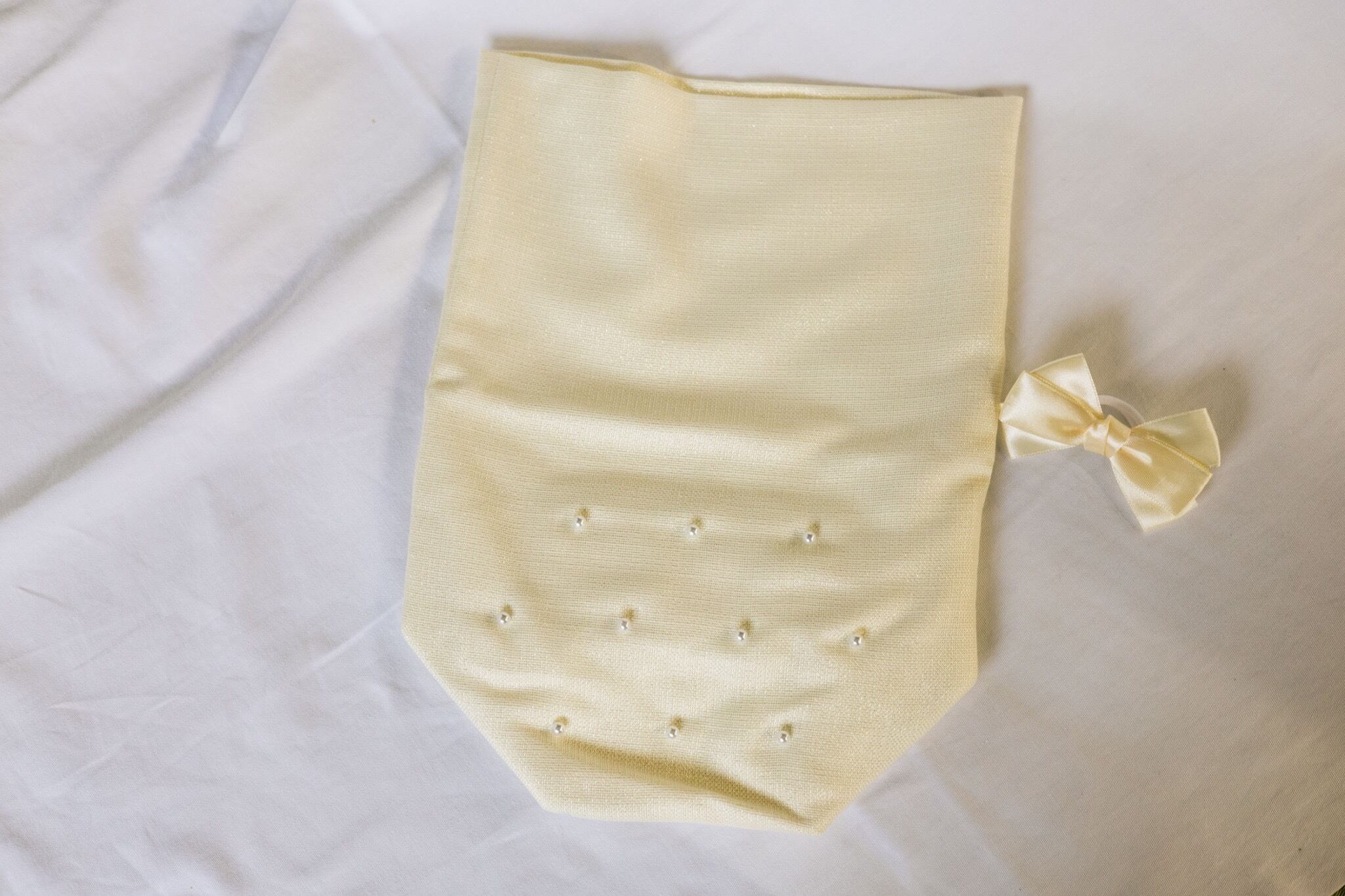 お骨壷のカバーです。オフホワイトのお色にパールが上品です。大きさは2寸から5寸のご用意があります。