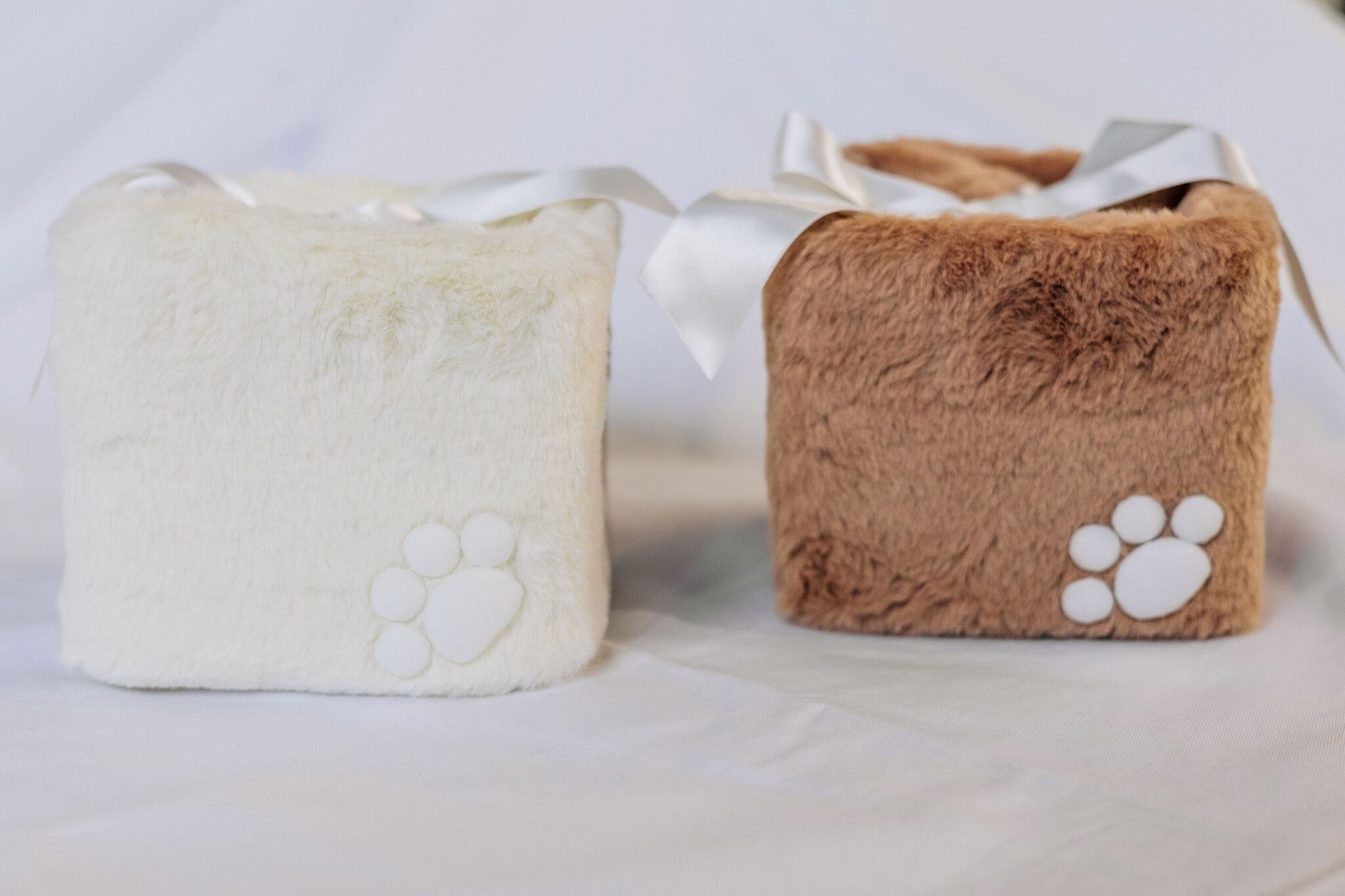 お骨壷のカバーです。ふわふわもこもこかわいいです。お色はホワイトとブラウン。大きさは3寸から5寸のご用意があります。肉球もかわいいです。