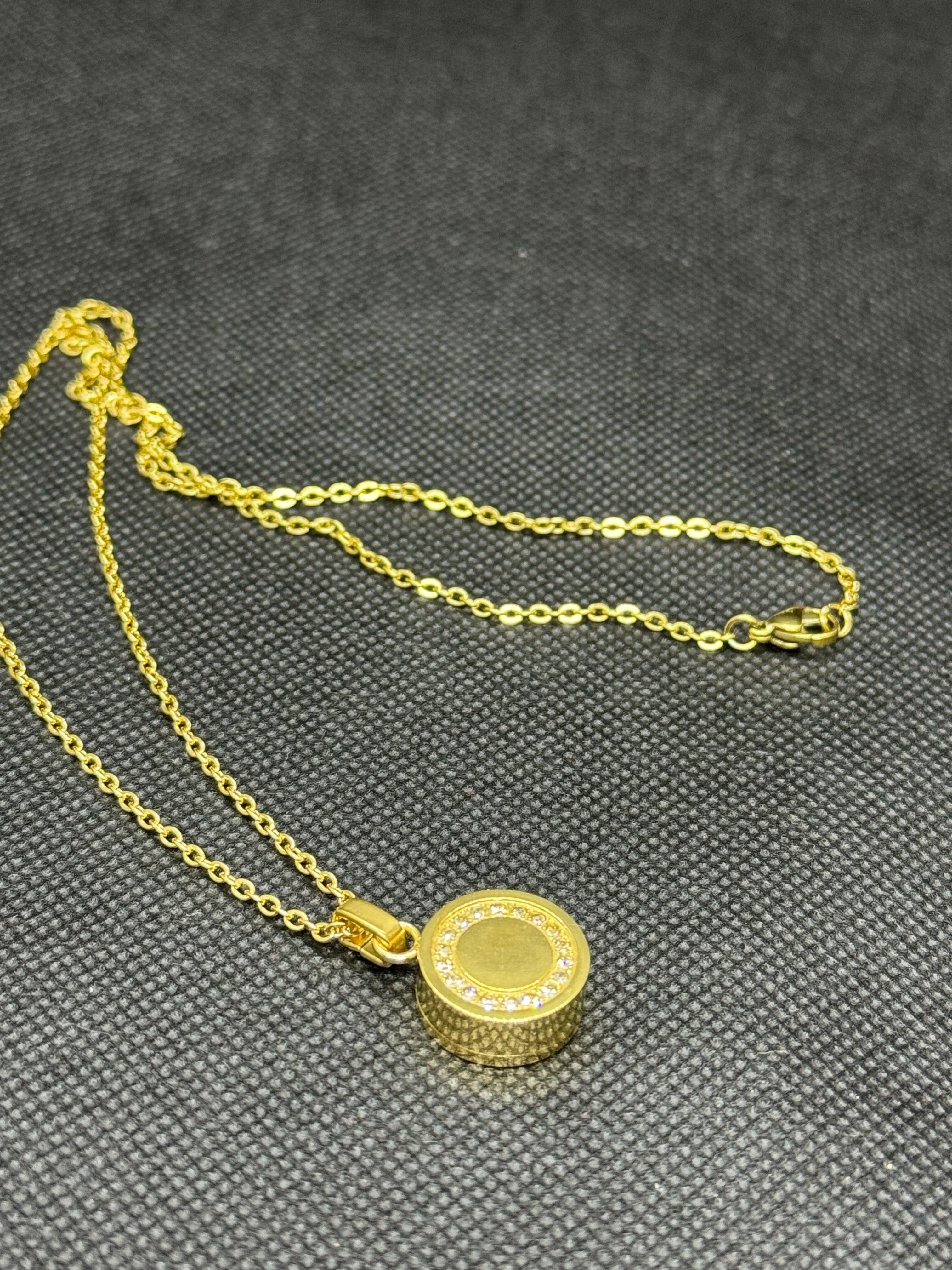 お骨の入るペンダントデス。チェーンの長さが50センチ。本体外寸直径1.5センチ、厚み0.65センチ 本体内寸直径1.4センチ、深さ0.3センチ。重さ約10g。金属アレルギー対応ステンレス製。